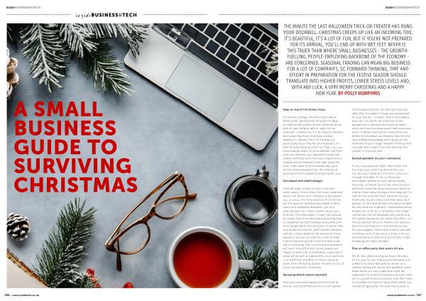 THE MINUTE THE LAST HALLOWEEN TRICK-OR-TREATER HAS RUNG YOUR DOORBELL, CHRISTMAS CREEPS UP LIKE AN INCOMING TIDE; IT’ S BEAUTIFUL, IT’ S A LOT OF FUN, BUT IF YOU’ RE NOT PREPARED FOR ITS ARRIVAL, YOU’ LL END UP WITH WET FEET. NEVER IS THIS TRUER THAN WHERE SMALL BUSINESSES- THE GROWTH- FUELLING, PEOPLE-EMPLOYING BACKBONE OF THE ECONOMY- ARE CONCERNED. SEASONAL TRADING CAN MEAN BIG BUSINESS FOR A LOT OF COMPANIES, SO FORWARD-THINKING, TIME AND EFFORT IN PREPARATION FOR THE FESTIVE SEASON SHOULD TRANSLATE INTO HIGHER PROFITS, LOWER STRESS LEVELS AND, WITH ANY LUCK, A VERY MERRY CHRISTMAS AND A HAPPY NEW YEAR. BY POLLY HUMPHRIS