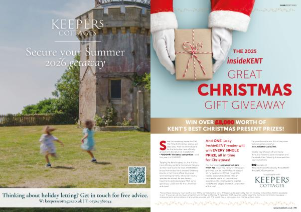 * No purchase necessary; must be 18 or over AND a Kent resident to enter. Entries must be received by 5pm on Thursday 11 December 2025 to be eligible to win. The winner will be chosen at random and notified by Monday 15 December 2025 via email and / or telephone. Terms and conditions may apply – individual terms and conditions( if any) will be provided with final prizes. Please note, prizes may change without notice. www. insidekent. co. uk • 85
