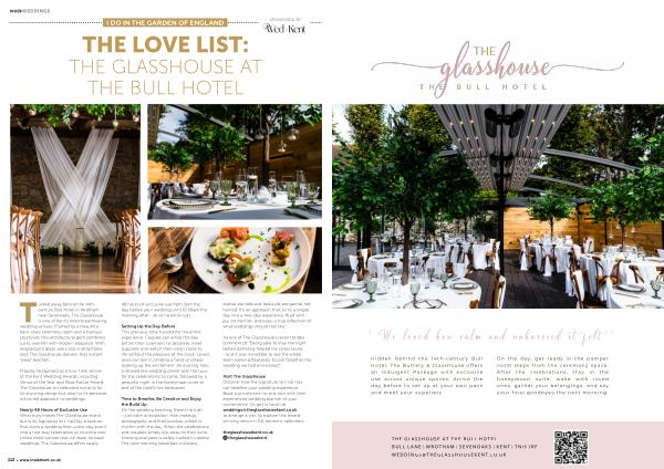 Tucked away behind the 14thcentury Bull Hotel in Wrotham near Sevenoaks, The Glasshouse is one of Kent’ s most breathtaking wedding venues. Framed by a beautiful barn-style ceremony room and a tranquil courtyard, this architectural gem combines rustic warmth with modern elegance. With wraparound glass walls and a retractable roof, The Glasshouse delivers that instant‘ wow!’ reaction.