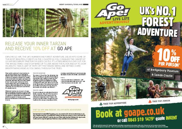Exclusively for insideKENT readers, you can receive 10 % off your adventures to Go Ape. Simply enter the code KNGAP7 during checkout at goape. co. uk or call 0845 519 1479 and quote KNGAP7 over the phone.( Offer valid Sunday-Friday at Go Ape Leeds Castle and Go Ape Bedgebury Pinetum only, until 31st December 2017).