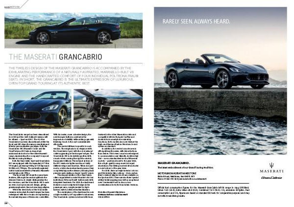 THE TIMELESS DESIGN OF THE MASERATI GRANCABRIO IS ACCOMPANIED BY THE EXHILARATING PERFORMANCE OF A NATURALLY ASPIRATED, MARANELLO-BUILT V8 ENGINE AND THE HANDCRAFTED COMFORT OF FOUR INDIVIDUAL POLTRONA FRAU ® SEATS. IN SHORT, THE GRANCABRIO IS THE ULTIMATE EXPRESSION OF LUXURIOUS, OPEN-TOP GRAND TOURING AT ITS AUTHENTIC BEST.