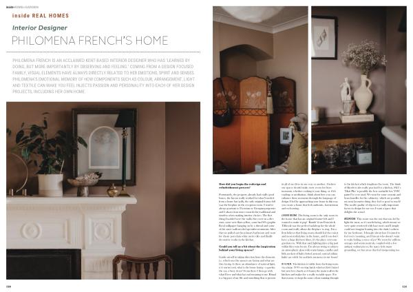 PHILOMENA FRENCH IS AN ACCLAIMED KENT-BASED INTERIOR DESIGNER WHO HAS ‘ LEARNED BY DOING , BUT MORE IMPORTANTLY BY OBSERVING AND FEELING .’ COMING FROM A DESIGN FOCUSED FAMILY , VISUAL ELEMENTS HAVE ALWAYS DIRECTLY RELATED TO HER EMOTIONS , SPIRIT AND SENSES . PHILOMENA ’ S EMOTIONAL MEMORY OF HOW COMPONENTS SUCH AS COLOUR , ARRANGEMENT , LIGHT AND TEXTILE CAN MAKE YOU FEEL INJECTS PASSION AND PERSONALITY INTO EACH OF HER DESIGN PROJECTS , INCLUDING HER OWN HOME .