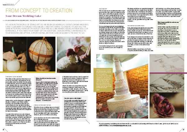 SO, HOW IN THE WORLD OF‘ EDIBLE ART’ DO WE BEGIN DESIGNING A COUPLE’ S DREAM WEDDING CAKE? CONTRARY TO A WIDELY HELD BELIEF, CAKE ISN ' T SIMPLE TO CREATE, IT ' S NOT ALL THE SAME IN TEXTURE, FLAVOUR OR QUALITY, NOR ARE ALL CAKE MAKERS EQUAL IN THEIR SKILLS OR EXPERIENCE. IF YOU HAVE YOUR HEART SET ON A BESPOKE, JAW-DROPPING CENTREPIECE TO YOUR WEDDING RECEPTION, A PROFESSIONAL BESPOKE CAKE DESIGNER IS THE WAY TO GO.