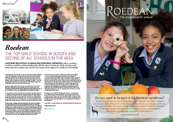 ‘ Excellent in every area’ in its recent ISI inspection report, Roedean has a holistic approach to education which embraces the wonder and excitement of learning, develops the talents of every girl, and kindles new passions. Happy, relaxed, and engaged, the girls are challenged in their learning, play cricket with the sea behind them, enjoy accommodation which is like a boutique hotel, and grow up at their own pace. www. roedean. co. uk