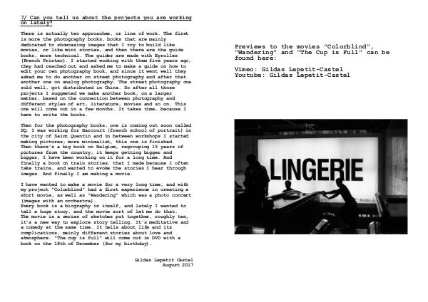 Then for the photography books, one is coming out soon called SQ. I was working for Harcourt( french school of portrait) in the city of Saint Quentin and in between workshops I started making pictures, more minimalist, this one is finished. Then there ' s a big book on Belgium, regrouping 15 years of pictures from the country, it keeps getting bigger and bigger, I have been working on it for a long time. And finally a book on train stories, that I made because I often take trains, and wanted to evoke the stories I hear through images. And finally I am making a movie.