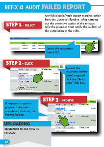 Any failed Refix/Audit Report requires action from the Licensed Plumber. After carrying out the corrective action of the relevant refix the plumber must notify the auditor of the completion of the refix.