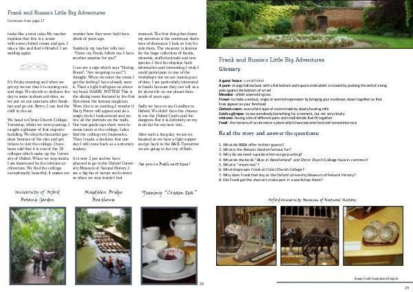 It is now 2 pm and we have planned to go to the Oxford University Museum of Natural History. I am a big fan of nature and science so when we step inside I feel stunned. The first thing that draws my attention is the enormous skeletons of dinosaurs. I look so tiny beside them. The museum is famous for the huge collection of fossils, minerals, stuffed animals and rare species. I find the displays both informative and interesting. I wish I could participate in one of the workshops but we are running out of time. I am particularly interested in fossils because they can tell us a lot about life on our planet thousands of years ago.