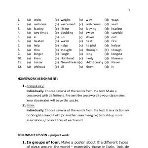 1. In groups of four. Make a poster about the different types of pizza around the world – especially those in Italy. Include pizza made in your country. Use a dictionary to help you. Show your poster to your class. Vote on the best one( s).
