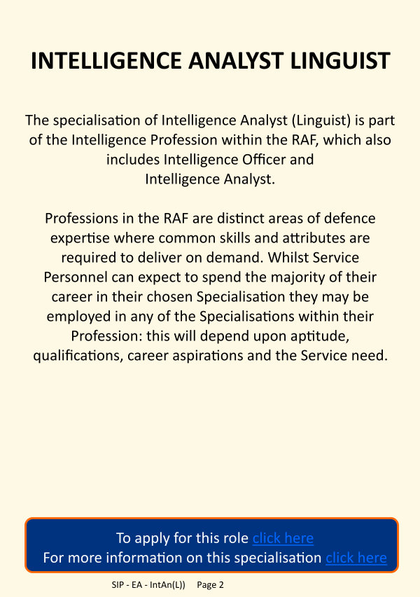 The specialisation of Intelligence Analyst( Linguist) is part of the Intelligence Profession within the RAF, which also includes Intelligence Officer and Intelligence Analyst.