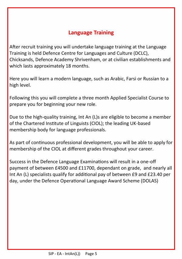 Success in the Defence Language Examinations will result in a one-off payment of between £ 4500 and £ 11700, dependant on grade, and nearly all Int An( L) specialists qualify for additional pay of between £ 9 and £ 23.40 per day, under the Defence Operational Language Award Scheme( DOLAS)