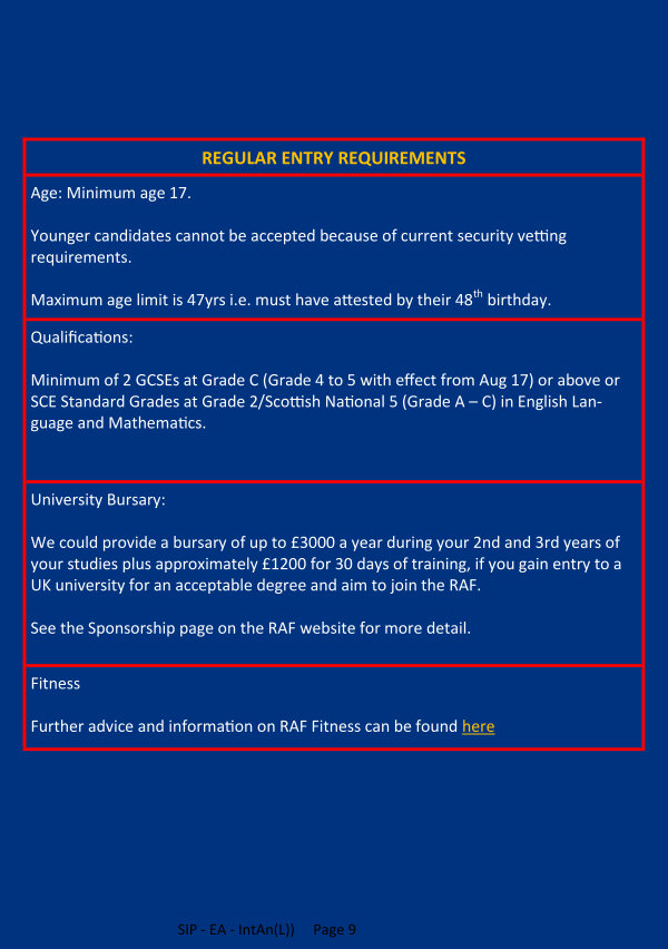 We could provide a bursary of up to £ 3000 a year during your 2nd and 3rd years of your studies plus approximately £ 1200 for 30 days of training, if you gain entry to a UK university for an acceptable degree and aim to join the RAF.