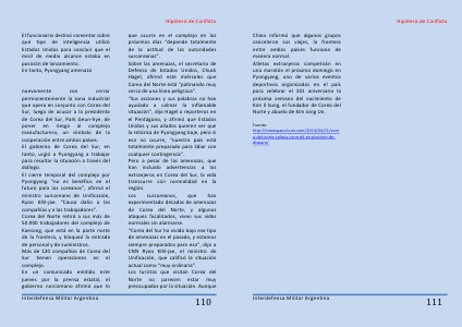 Interdefensa Militar Argentina que ocurra en el complejo en los próximos días“ depende totalmente de la actitud de las autoridades surcoreanas”. Sobre las amenazas, el secretario de Defensa de Estados Unidos, Chuck Hagel, afirmó este miércoles que Corea del Norte está“ patinando muy cerca de una línea peligrosa”.“ Sus acciones y sus palabras no han ayudado a calmar la inflamable situación”, dijo Hagel a reporteros en el Pentágono, y afirmó que Estados Unidos y sus aliados quieren ver que la retórica de Pyongyang baje, pero si eso no ocurre,“ nuestro país está totalmente preparado para lidiar con cualquier contingencia”. Pero a pesar de las amenazas, que han incluido advertencias a los extranjeros en Corea del Sur, la vida transcurre con normalidad en la región. Los surcoreanos, que han experimentado décadas de amenazas de Corea del Norte, y algunos ataques focalizados, viven sus vidas normales sin alarmarse.“ Corea del Sur ha vivido bajo ese tipo de amenazas en el pasado, y estamos siempre preparados para eso”, dijo a CNN Ryoo Kihl-jae, el ministro de Unificación, que calificó la situación actual como“ muy ordinaria”. Los turistas que visitan Corea del Norte no parecen estar muy preocupados por la situación. Aunque