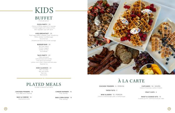 KIDS BREAKFAST • 25 Pearl sugar waffles, whipped cream, strawberries White cheddar scrambled eggs Seasonal fruit Smokehouse bacon and chicken sausage