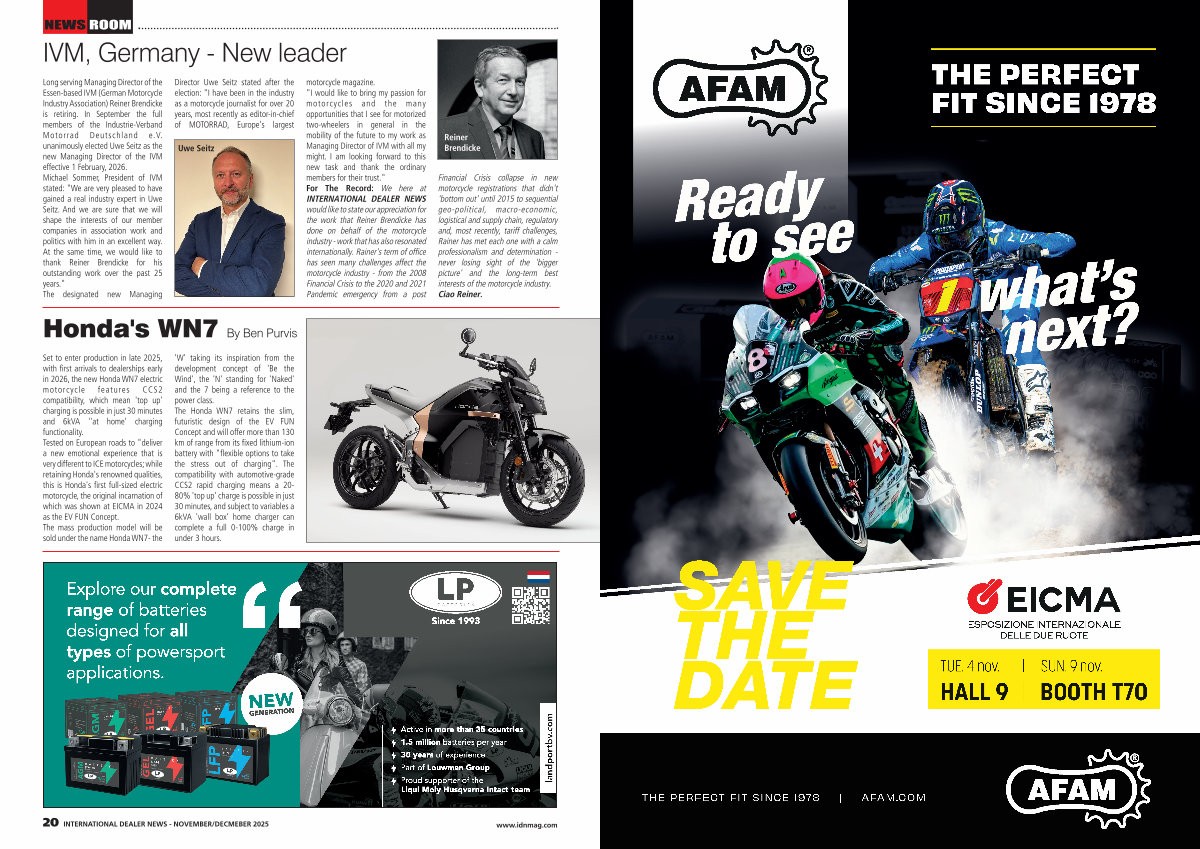 Uwe Seitz motorcycle magazine. " I would like to bring my passion for motorcycles and the many opportunities that I see for motorized two-wheelers in general in the mobility of the future to my work as Managing Director of IVM with all my might. I am looking forward to this new task and thank the ordinary members for their trust." For The Record: We here at INTERNATIONAL DEALER NEWS would like to state our appreciation for the work that Reiner Brendicke has done on behalf of the motorcycle industry- work that has also resonated internationally. Rainer ' s term of office has seen many challenges affect the motorcycle industry- from the 2008 Financial Crisis to the 2020 and 2021 Pandemic emergency from a post