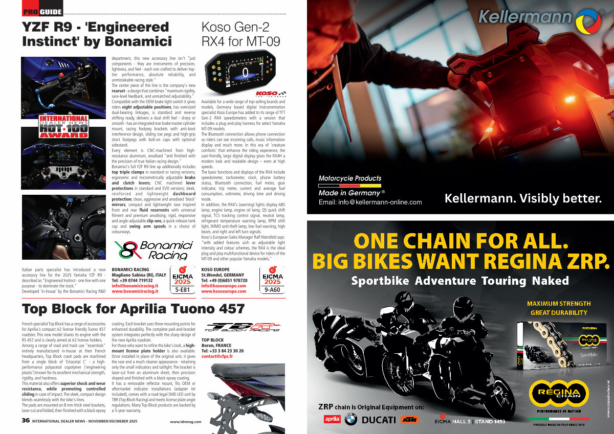 department, this new accessory line isn ' t " just components- they are instruments of precision, lightness, and feel- each one crafted to deliver toptier performance, absolute reliability, and unmistakable racing style." The center piece of the line is the company ' s new rearset- a design that combines " maximum rigidity, race-level feedback, and unmatched adjustability." Compatible with the OEM brake light switch it gives riders eight adjustable positions, has oversized dual-bearing linkages, is standard and reverse shifting ready, delivers a dual shift feel- sharp or smooth- has an integrated rear brake master cylinder mount, racing footpeg brackets with anti-boot interference design, sliding toe pegs and high-grip short footpegs with bolt-on caps with optional sidestand. Every element is CNC-machined from highresistance aluminum, anodised " and finished with the precision of true Italian racing design." Bonamici ' s full YZF R9 line up additionally includes top triple clamps in standard or racing versions; ergonomic and micrometrically adjustable brake and clutch levers; CNC machined lever protections in standard and EVO versions; sleek, reinforced and lightweight dashboard protection; clean, aggressive and anodised ' block ' mirrors; compact and lightweight race inspired front and rear fluid reservoirs with universal fitment and premium anodising; rigid, responsive and angle-adjustable clip-ons; a quick-release tank cap and swing arm spools in a choice of colourways.
