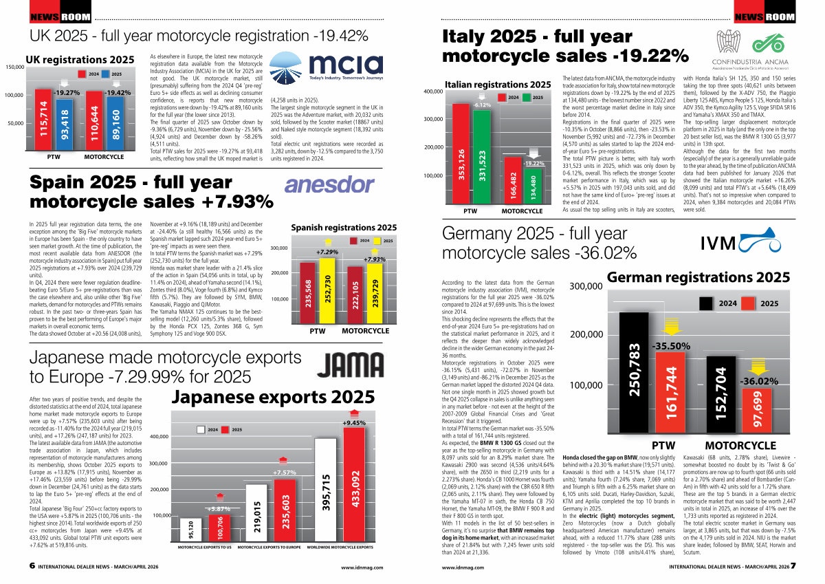 The latest data from ANCMA, the motorcycle industry trade association for Italy, show total new motorcycle registrations down by-19.22 % by the end of 2025 at 134,480 units- the lowest number since 2022 and the worst percentage market decline in Italy since before 2014. Registrations in the final quarter of 2025 were-10.35 % in October( 8,866 units), then-23.53 % in November( 5,992 units) and-72.73 % in December( 4,570 units) as sales started to lap the 2024 endof-year Euro 5 + pre-registrations. The total PTW picture is better, with Italy worth 331,523 units in 2025, which was only down by 0-6.12 %, overall. This reflects the stronger Scooter market performance in Italy, which was up by + 5.57 % in 2025 with 197,043 units sold, and did not have the same kind of Euro + ' pre-reg ' issues at the end of 2024. As usual the top selling units in Italy are scooters, |