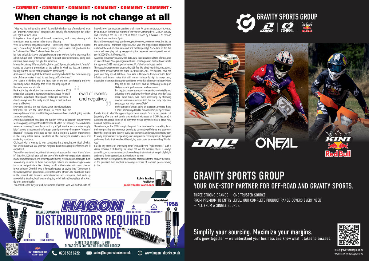 " May you live in interesting times " is a widely cited phrase often referred to as an " ancient Chinese curse," though it is not actually of Chinese origin, but rather an English-derived idiom. It implies a time of political turmoil, uncertainty, and chaos, viewing such tumultuous eras as a curse rather than a blessing. Well, for sure these are just exactly that- " interesting times " though not in a good way- " interesting " for all the wrong reasons- bad reasons not good ones. But isn ' t always thus? Hasn ' t always been this way? It ' s hard to look back over the last sixty years or so without having the sense that all times have been " interesting ", and, no doubt, prior generations, going back millennia, have always thought the same too. Maybe the primary difference is that, in the past 25 years, since electronic " media " started to shape our perceptions of the bubble in which we live, am I alone in feeling that the rate of change has been accelerating? Am I alone in thinking that the inherent jeopardy locked into that ever-increasing rate of change makes it hard ' to see the good for the trees '? Am I alone in thinking that the latest turn of the ever accelerating and ever worsening wheel of change that we ' re enduring is just offthe-scale awful and stupid? Back at the day job, a lot of the commentary about the 2025 registration statistics is now starting to be exposed for the illinformed, superficial, strategically challenged nonsense it clearly always was. The really stupid thing is that we have seen it all before. Every time there is a ' pre-reg ' drama when there is regulatory transition, we see the same failure to realise that the motorcycles concerned are still sitting on showroom floors and still going to make someone very happy. And it has happened yet again. The sudden reversal in apparent industry trend seen magically, overnight from December 31, 2025 to 1 January 2026 is dues to someone throwing " I must buy a motorcycle " pill into the world ' s water supply, it isn ' t due to a sudden and unforeseen overnight recovery from some " depth of despond " recession, and it sure as heck isn ' t a result of a sudden improvement in the really rather dismal standards of the motorcycle market ' s sales and marketing standards. Oh, how I wish it were to do with something that simple, but no. Much of what was written and said last year was misguided and misleading; ill-informed and ill considered. The swirl of events and negatives that are storming around us mean it is no ' shooin ' that the 2026 full year will see any of the early year registrations statistics momentum maintained. The present positivity may well end up crumbling to dust, smouldering in ashes as those that multiple nations and dumb enough to vote for prove that politicians, like children, should not be trusted with sharp scissors. It was Winston Churchill who is famously quoted as saying that " Democracy is the worst system of government, except for all the others ". We must hope that it is the present drift towards authoritarianism and corruption that ends up smouldering in ashes, but if we are all going to hell in hand basket let ' s all at least do it on a motorcycle! Two months into the year and the number of citizens who will do that, ride off