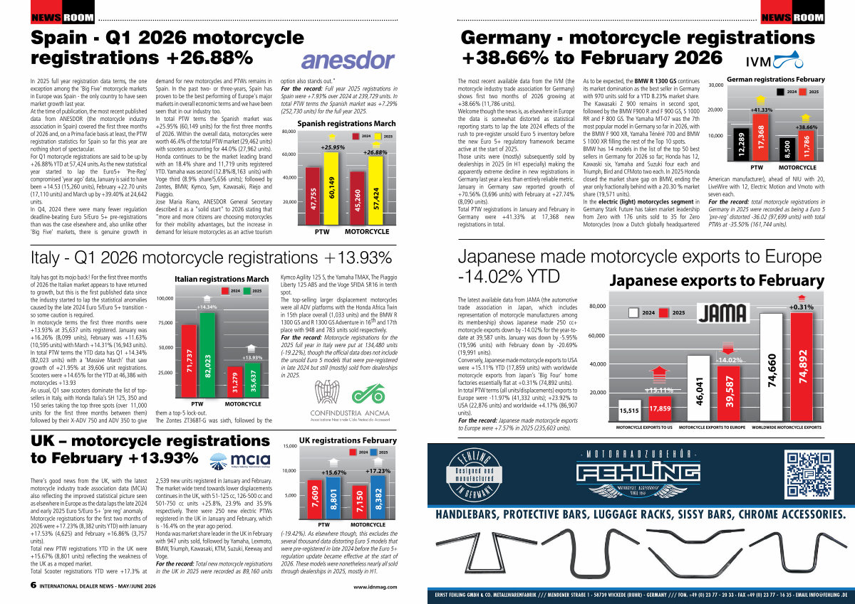The latest available data from JAMA( the automotive trade association in Japan, which includes representation of motorcycle manufacturers among its membership) shows Japanese made 250 cc + motorcycle exports down by-14.02 % for the year-todate at 39,587 units. January was down by-5.95 %( 19,596 units) with February down by-20.69 %( 19,991 units). Conversely, Japanese made motorcycle exports to USA were + 15.11 % YTD( 17,859 units) with worldwide motorcycle exports from Japan’ s‘ Big Four’ home factories essentially flat at + 0.31 %( 74,892 units). In total PTW terms( all units / displacements) exports to Europe were-11.97 %( 41,332 units); + 23.92 % to USA( 22,876 units) and worldwide + 4.17 %( 86,907 units). For the record: Japanese made motorcycle exports to Europe were + 7.57 % in 2025( 235,603 units). |