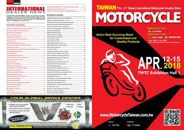 ANESDOR( ES) StatZone: Spanish motorcycle registrations down.................................................. 7 ACEM( BE) EU motorcycle registrations down-1.6 percent............................................................ 1 ANCMA( IT) StatZone: Italian motorcycle registrations up significantly.......................................... 6 Barnett Clutches & Cables( US) Hydraulic brake and clutch lines.................................................. 36 BC Battery Controller( IT) BC 5000 EVO + battery charger............................................................ 42 Bultaco Motors( ES) Signing dealers for new breed of crossover bikes.................................... 12-13 Davida( GB) Koura full-face helmet............................................................................................ 39 DIMSPORT( IT) Rapid Bike shift assist.......................................................................................... 40 EICMA( IT) EICMA 2017 review feature................................................................................ 16-32 Federal Mogul Italy( IT) Ferodo MXR discs.................................................................................. 35 GIVI( IT) ' Canyon ' soft side bags................................................................................................ 34 Hevik( IT) ' Portland ' urban jacket................................................................................................ 44 IVM( DE) StatZone: Motorcycle sales down YTD............................................................................ 7 JAMA( JP) StatZone: Exports to Europe up massively.................................................................... 6 Kappa( IT) ' Black Line ' Garda cases............................................................................................ 38 LeoVince( IT) LV-10 slip-on.......................................................................................................... 42 Locatelli( IT) Airoh ' Executive ' modular / crossover helmet............................................................ 40 MAG Inc( US) Chapter 11 bankruptcy protection filings................................................................ 8 Matris( IT) Conventional and inverted suspension choices............................................................ 38 Mayo Media( GB) Motorcycle Trade Expo January 2018.............................................................. 48 Motoplastic( ES) F1 and GT rear mirrors...................................................................................... 34 MCIA( GB) StatZone: UK Motorcycle registrations down................................................................ 7 Nexx Helmets( PT) X. WED 2 dual-sport upgrade.......................................................................... 41 Orina( DE) Heated glove technology............................................................................................ 14 PBR Sprockets( IT) Rubber dampened front sprockets.................................................................. 40 PZPM( PL) StatZone: New motorcycle registrations down.............................................................. 6 Premier Helmets( IT) VYRUS helmet; 5-year warranty from 2018.................................................. 37 Pyramid Plastics( GB) MT-07 belly pans and huggers.................................................................. 42 SHAD Luggage( ES) SH46 top case.............................................................................................. 42 Sifam Trading( FR) One of the world ' s lightest flip front helmets.................................................. 14 Stylmartin( IT) PPE certified ' Matrix ' touring boot........................................................................ 14 TecMate International( BE) OptiMate USB O-115........................................................................ 43 Touratech( DE) Business as usual after bankruptcy protection filing............................................ 10 Twin Air( NL) ' IceFlow ' coolant.................................................................................................... 34 UFO Plast( IT) X-Concept chest protector; Siachen body suit........................................................ 44 Vertex Pistons- VP Italy( IT) 2018 additions................................................................................ 36 Wunderlich( DE) New corporate headquarters............................................................................ 48