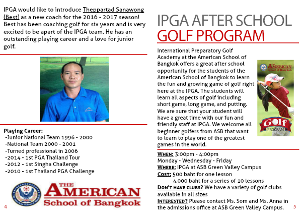 International Preparatory Golf Academy at the American School of Bangkok offers a great after school opportunity for the students of the American School of Bangkok to learn the fun and growing game of golf right here at the IPGA. The students will learn all aspects of golf including short game, long game, and putting. We are sure that your student will have a great time with our fun and friendly staff at IPGA. We welcome all beginner golfers from ASB that want to learn to play one of the greatest games in the world.