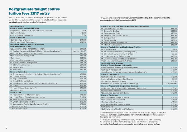 For EU, UK and part-time www.keele/ac/uk/studentfunding/tuitionfees/ukeustudentspostgraduatetaughttuitionfees/pgtfees2017