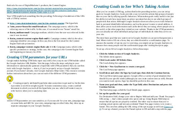 After you’ ve created a UTM tag, as described in the preceding section, you can set up goals in Google Analytics. Goals provide a way to track the actions that groups of people take on your site by tallying specific behaviors. What makes goals really useful is not just the ability to track how many times an action was taken but also to see which groups of people took that action. Although Google Analytics does not allow you to track behavior back to personal identifiable information, such as the person’ s name or email address, it does allow you to track information such as the device they are using, where people are in the world, or the other pages they visited on your website. Thanks to the UTM parameters, you can actually see what individuals and groups of individuals do when they arrive on your site.