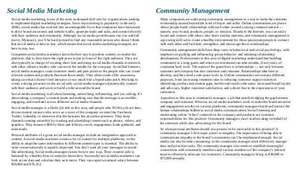 A position in this area is community manager, a job that entails bridging the gap between company and customer. Whereas social media marketers work to make the brand attractive and engagement-worthy on various platforms, community managers build and nurture the human relationships hidden in social media communication. Social listening and moderating online“ tribes” centered on the company and products are common responsibilities for this position. Community managers excel at advocating on behalf of the customer while also advocating for the brand.