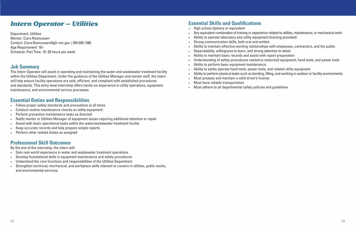 Department: Utilities Mentor: Ciara Rasmussen Contact: Ciara. Rasmussen @ glt-nsn. gov | 269.509.1266 Age Requirement: 18 + Schedule: Part Time, 10 – 20 hours per week