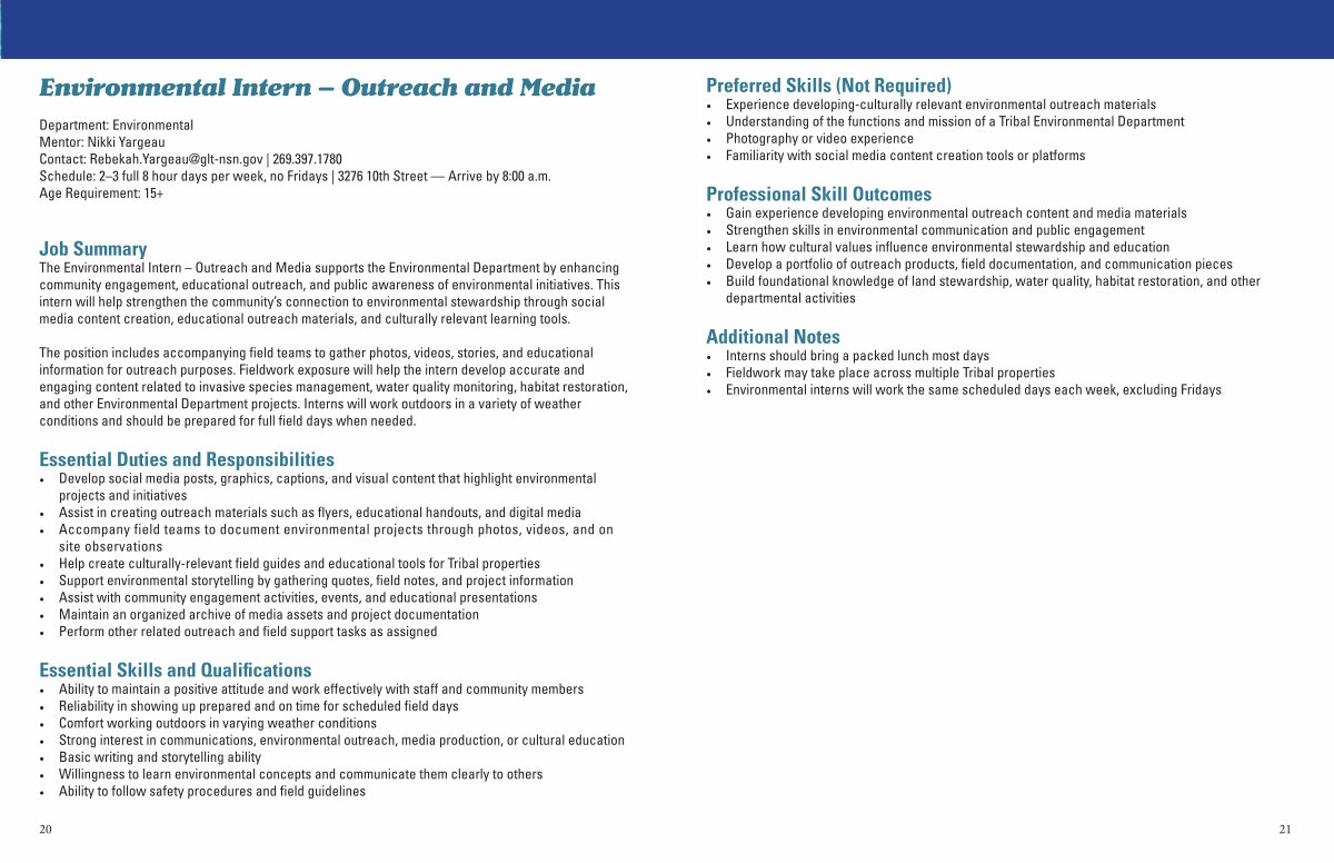 • Build foundational knowledge of land stewardship, water quality, habitat restoration, and other departmental activities