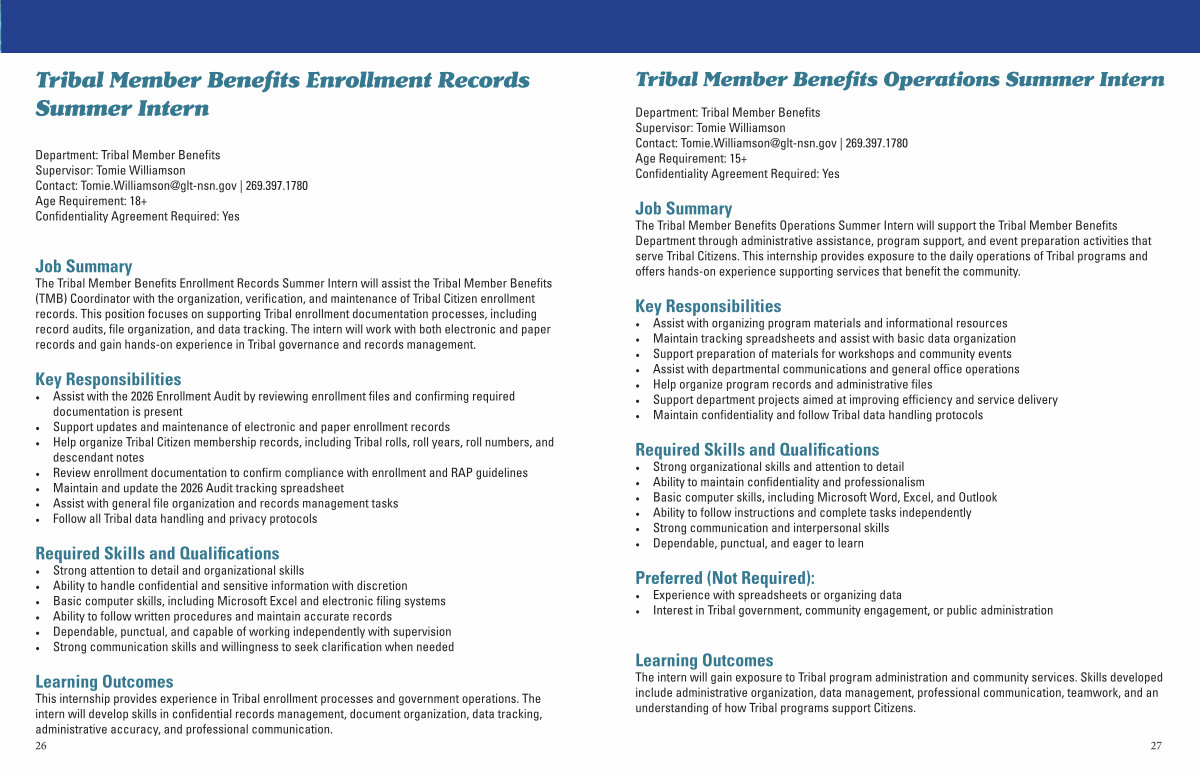 Department: Tribal Member Benefits Supervisor: Tomie Williamson Contact: Tomie. Williamson @ glt-nsn. gov | 269.397.1780 Age Requirement: 18 + Confidentiality Agreement Required: Yes