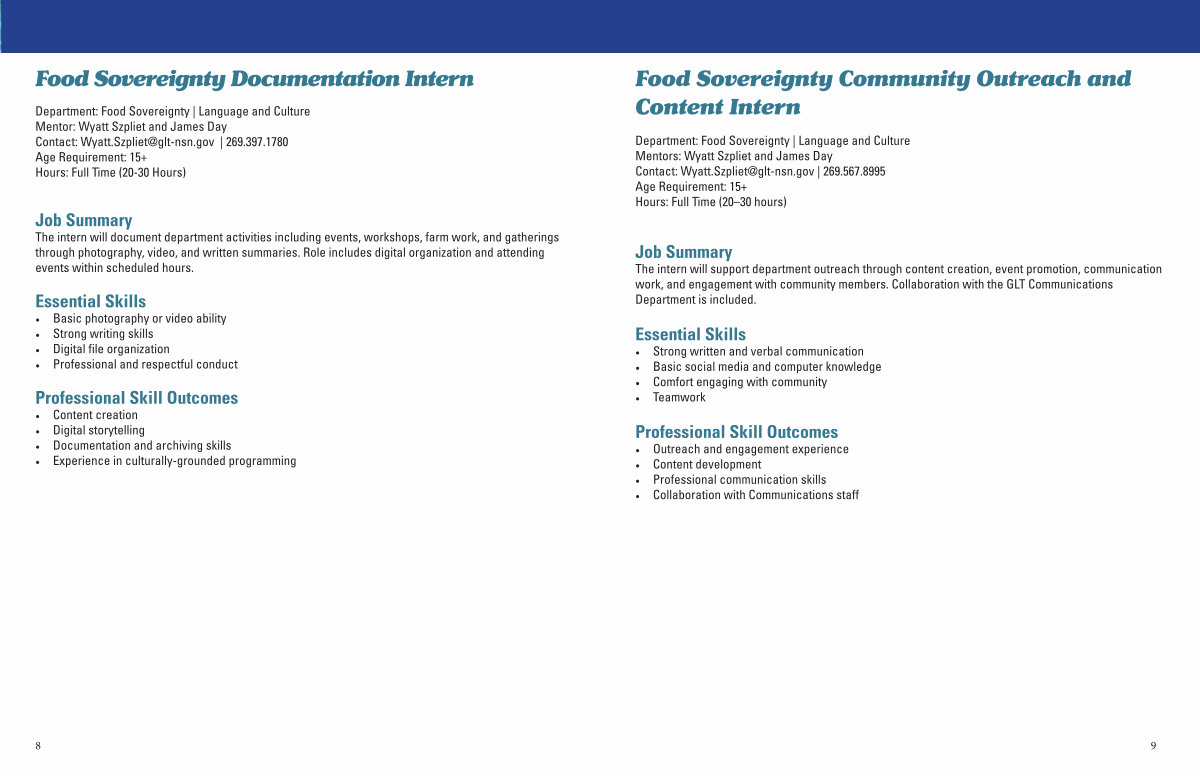 Department: Food Sovereignty | Language and Culture Mentors: Wyatt Szpliet and James Day Contact: Wyatt. Szpliet @ glt-nsn. gov | 269.567.8995 Age Requirement: 15 + Hours: Full Time( 20 – 30 hours)