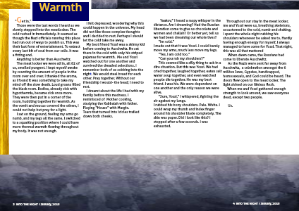 Those were the last words I heard as we slowly stepped into the meatlocker. The cold rushed in immediately. It seemed as though the Nazi officials running this place had run out of ways to punish us. This was their last form of entertainment. To extract every last bit of soul from our cells. It was a fitting end.