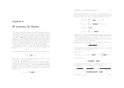 El cálculo del valor de un polinomio en un punto cualquiera es una operación algebraica elemental, ya que se reduce a un número finito de sumas y productos. No ocurre lo mismo, en general, con una función no polinómica, ni siquiera para funciones elementales sencillas; por ejemplo, ¿ cómo se calcula sen1, ó e √2? Resulta por ello de gran importancia práctica el poder aproximar una función cualquiera( suficientemente regular) en las proximidades de un punto por un polinomio adecuado. En este capítulo estudiaremos esta cuestión, prestando especial atención a obtener estimaciones del error cometido al reemplazar una función por su aproximación polinómica.