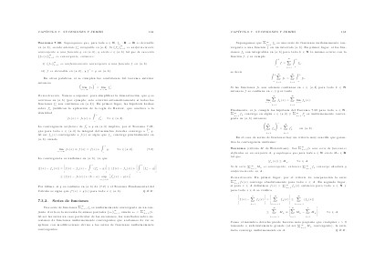 Teorema 7.30. Supongamos que, para todo n ∈ N, f n: R → R es derivable en( a, b), siendo además f n ′ integrable en [ a, b ]. Si { f n ′ } ∞ n = 1 es uniformemente convergente a una función g en( a, b), y existe c ∈( a, b) tal que la sucesión { f n( c)} ∞ n = 1 es convergente, entonces: i) { f n } ∞ n = 1 es uniformemente convergente a una función f en( a, b) ii) f es derivable en( a, b), y f ′ = g en( a, b).