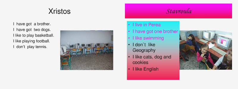 Xristos I have got a brother. I have got two dogs. I like to play basketball. I like playing football. I don’t play tennis.