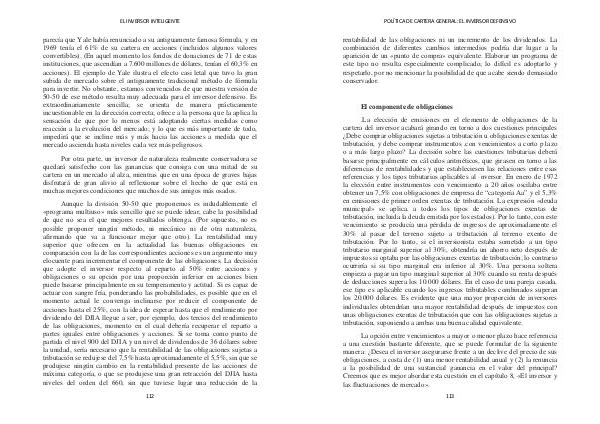parecía que Yale había renunciado a su antiguamente famosa fórmula, y en 1969 tenía el 61 % de su cartera en acciones( incluidos algunos valores convertibles).( En aquel momento los fondos de donaciones de 71 de estas instituciones, que ascendían a 7.600 millones de dólares, tenían el 60,3 % en acciones). El ejemplo de Yale ilustra el efecto casi letal que tuvo la gran subida de mercado sobre el antiguamente tradicional método de fórmula para invertir. No obstante, estamos convencidos de que nuestra versión de 50-50 de ese método resulta muy adecuada para el inversor defensivo. Es extraordinariamente sencilla; se orienta de manera prácticamente incuestionable en la dirección correcta; ofrece a la persona que la aplica la sensación de que por lo menos está adoptando ciertas medidas como reacción a la evolución del mercado; y lo que es más importante de todo, impedirá que se incline más y más hacia las acciones a medida que el mercado ascienda hasta niveles cada vez más peligrosos.