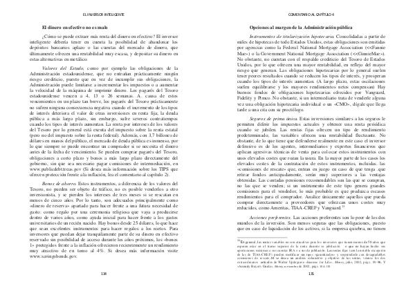 Instrumentos de titularización hipotecaria. Consolidadas a partir de miles de hipotecas de todo Estados Unidos, estas obligaciones son emitidas por agencias como la Federal National Mortgage Association(<< Fannie Mae ») o la Government National Mortgage Association(<< GinnieMae »). No obstante, no cuentan con el respaldo crediticio del Tesoro de Estados Unidos, por lo que ofrecen una mayor rentabilidad, en reflejo del mayor riesgo que generan. Las obligaciones hipotecarias por lo general suelen tener peores resultados cuando se reducen los tipos de interés, y prosperan cuando los tipos de interés aumentan.( A largo plazo, estas oscilaciones suelen equilibrarse y los mayores rendimientos netos compensan) Hay buenos fondos de obligaciones hipotecarias ofrecidos por Vanguard, Fidelity y Pimco. No obstante, si un intermediario trata de venderle alguna vez una obligación hipotecaria individual o un « CMO », dígale que llega tarde a una cita con su proctólogo.