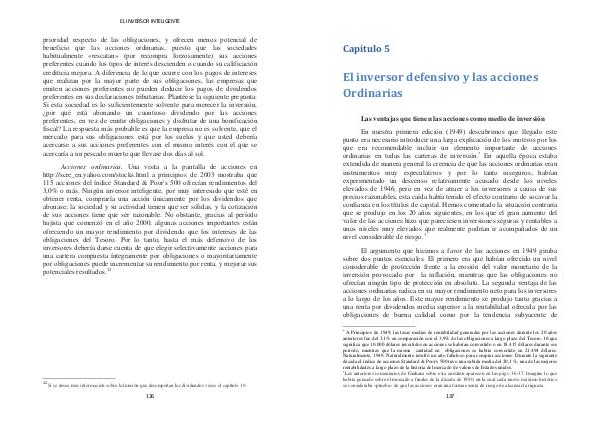 En nuestra primera edición( 1949) descubrimos que llegado este punto era necesario introducir una larga explicación de los motivos por los que era recomendable incluir un elemento importante de acciones ordinarias en todas las carteras de inversión. * En aquella época estaba extendida de manera general la creencia de que las acciones ordinarias eran instrumentos muy especulativos y por lo tanto inseguros; habían experimentado un descenso relativamente acusado desde los niveles elevados de 1946, pero en vez de atraer a los inversores a causa de sus precios razonables, esta caída había tenido el efecto contrario de socavar la confianza en los títulos de capital. Hemos comentado la situación contraria que se produjo en los 20 años siguientes, en los que el gran aumento del valor de las acciones hizo que pareciesen inversiones seguras y rentables a unos niveles muy elevados que realmente podrían ir acompañados de un nivel considerable de riesgo. †
