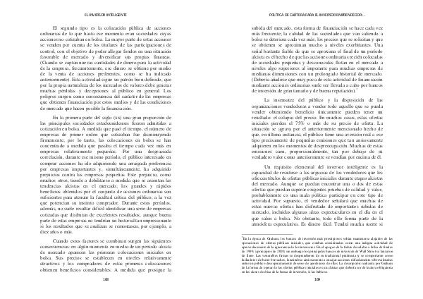 subida del mercado, esta forma de financiación se hace cada vez más frecuente; la calidad de las sociedades que van saliendo a bolsa se deteriora cada vez más; los precios que se solicitan y que se obtienen se aproximan mucho a niveles exorbitantes. Una señal bastante fiable de que se aproxima el final de un período alcista es el hecho de que las acciones ordinarias recién colocadas de sociedades pequeñas y desconocidas flotan en el mercado a niveles algo superiores al imperante para muchas empresas de medianas dimensiones con un prolongado historial de mercado.( Debería añadirse que muy poca de esta actividad de financiación mediante acciones ordinarias suele ser llevada a cabo por bancos de inversión de gran tamaño y de buena reputación). *