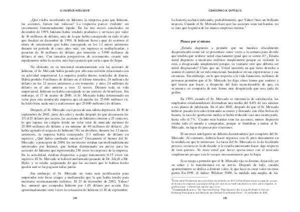Después, el Sr. Mercado cayó presa de una súbita depresión. El 30 de septiembre de 2002, justo dos años y medio después de que alcanzasen los 231,625 dólares por acción, las acciones de Inktomi cerraron a 25 centavos, lo que supuso un colapso desde un valor total de mercado máximo de 25.000 millones de dólares a un mínimo de 40 millones de dólares. ¿ Se había agotado el negocio de Inktomi? No en absoluto; durante los 12 meses anteriores, la empresa había conseguido 113 millones de dólares en ingresos. ¿ Qué había cambiado entonces? Únicamente el humor del Sr. Mercado: a principios de 2000, los inversores estaban tan irrefrenablemente interesados por Internet, que habían determinado un precio para las acciones de Inktomi que representaba 250 veces los ingresos de la empresa. En la actualidad, estaban dispuestos a pagar únicamente 0,35 veces sus ingresos. El Sr. Mercado se había transformado pasando de Dr. Jekyll a Mr. Hyde, y se estaba asegurando de que las acciones que le habían hecho quedar mal se las pagasen todas juntas.
