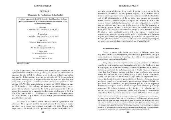 mercado, porque el objetivo de un fondo de índice consiste en igualar la rentabilidad del mercado, no en superarla. El gestor de su fondo de índice no se la jugará apostando a que el siguiente sector con resultados brillantes será el del teletransporte, o el de los sitios web capaces de transmitir aromas, o el de las clínicas de pérdida de peso por telepatía; el fondo estará presente siempre en todas las empresas, y no sólo en aquellas que el gestor trate de adivinar que van a ser la siguiente maravilla. Sin embargo, a medida que pasen los años, la ventaja de coste de la indexación seguirá devengando rentabilidad incesantemente. Tenga un fondo de índice durante 20 años o más, aportando dinero todos los meses, y podrá estar prácticamente seguro de que conseguirá mejores resultados que la inmensa mayoría de los inversores profesionales y particulares. En los últimos años de subida, Graham alabó a los fondos de índices como la mejor opción para los inversores, individuales, al igual que lo hace Warren Buffett. 6