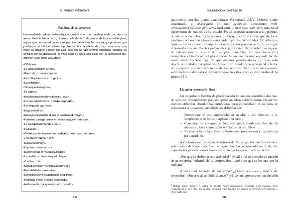 documento con dos partes denominado Formulario ADV. Debería poder examinarlo y descargarlo en las siguientes direcciones web: www. advisorinfo. sec. gov, www. iard. com, o en el sitio web de la autoridad supervisora de valores de su estado. Preste especial atención a las páginas de información sobre declaraciones, en las que. el asesor tiene que declarar cualquier acción disciplinaria emprendida por las autoridades.( Se sabe que algunos asesores poco escrupulosos retiran estas páginas antes de entregar el formulario a sus clientes potenciales, por loque debería usted encargarse de obtener por su. cuenta un ejemplar completo). Es una buena idea comprobar el historial del planificador financiero en una segunda fuente como www. cfp-board. org, ya que algunos planificadores que han sido objeto de medidas disciplinarias fuera de su estado de origen pueden tratar de escaparse por los vericuetos de las normas. Tiene más indicaciones sobre la forma de realizar esta investigación exhaustiva en el recuadro de la página 310.
