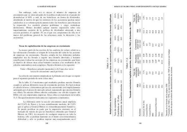La mayor parte de los escritos de los analistas de valores relativos a las valoraciones formales se ocupan de la tasación del valor de las acciones de empresas en crecimiento. Nuestro estudio de los diferentes métodos empleados nos ha llevado a sugerir una fórmula abreviada y bastante sencilla para evaluar las acciones de las empresas en crecimiento, que tiene el objetivo de ofrecer unas cifras bastante cercanas a las resultantes de los cálculos matemáticos más complejos. Nuestra fórmula es la siguiente: