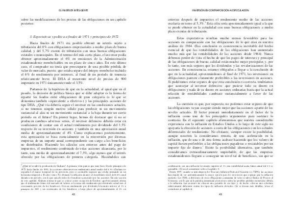 Partamos de la hipótesis de que en la actualidad, al igual que en el pasado, la decisión de política básica que se debe adoptar es la forma de repartir los fondos entre obligaciones de gran categoría( o lo que se denomina también « equivalente a efectivo ») y las principales acciones de tipo DJIA. ¿ Qué vía debería seguir el inversor en las condiciones actuales, si no tenemos ningún motivo sólido para predecir ni un movimiento sustancial al alza ni un movimiento sustancial a la baja durante un cierto período en el futuro? En primer lugar, hemos de destacar que si no se producen cambios adversos serios, el inversor defensivo debería estar en condiciones de contar con el actual rendimiento por dividendo del 3,5 % respecto de su inversión en acciones y también en una apreciación anual media de aproximadamente el 4 %. Como explicaremos posteriormente, esta apreciación se basa esencialmente en la reinversión por diversas empresas de un importe anual correspondiente con cargo a los beneficios no distribuidos. Haciendo los cálculos con criterios antes del pago de impuestos, el rendimiento combinado de estas acciones alcanzaría, por lo tanto, una media de aproximadamente el 7,5 %, algo menos que el interés ofrecido por las obligaciones de primera categoría. * Haciéndolos con