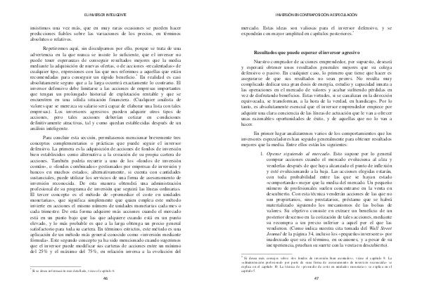 Repetiremos aquí, sin disculparnos por ello, porque se trata de una advertencia en la que nunca se insiste lo suficiente, que el inversor no puede tener esperanzas de conseguir resultados mejores que la media mediante la adquisición de nuevas ofertas, o de acciones « recalentadas » de cualquier tipo, expresiones con las que nos referimos a aquellas que están recomendadas para conseguir un rápido beneficio. * En realidad es casi absolutamente seguro que a la larga ocurrirá exactamente lo contrario. El inversor defensivo debe limitarse a las acciones de empresas importantes que tengan un prolongado historial de explotación rentable y que se encuentren en una sólida situación financiera.( Cualquier analista de valores que se merezca su salario será capaz de elaborar una lista con tales empresas). Los inversores agresivos pueden adquirir otros tipos de acciones, pero tales acciones deberían cotizar en condiciones definitivamente atractivas, tal y como quedan establecidas después de un análisis inteligente.