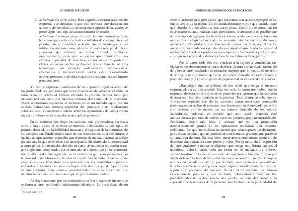 En su esfuerzo por elegir las acciones más prometedoras ya sea a corto o largo plazo, el inversor se enfrenta a obstáculos de dos tipos, el primero derivado de la falibilidad humana y el segundo de la naturaleza de su competición. Puede equivocarse en sus estimaciones sobre el futuro; o incluso aunque acierte, es posible que el precio de mercado actual ya refleje plenamente lo que el inversor está anticipando. En el área de la selectividad a corto plazo, los resultados del año en curso de una empresa suelen estar, por lo general, descontados por el mercado de valores, que ya los conocerá; los resultados del año siguiente, en la medida en que sean previsibles, ya habrán sido cuidadosamente tenidos en cuenta. Por lo tanto, el inversor que elige emisiones basándose principalmente en los resultados superiores obtenidos en el año en curso, o en lo que se le dice que puede esperar para el año próximo, tiene muchas probabilidades de encontrarse con que muchos otros han hecho lo mismo que él, por el mismo motivo.