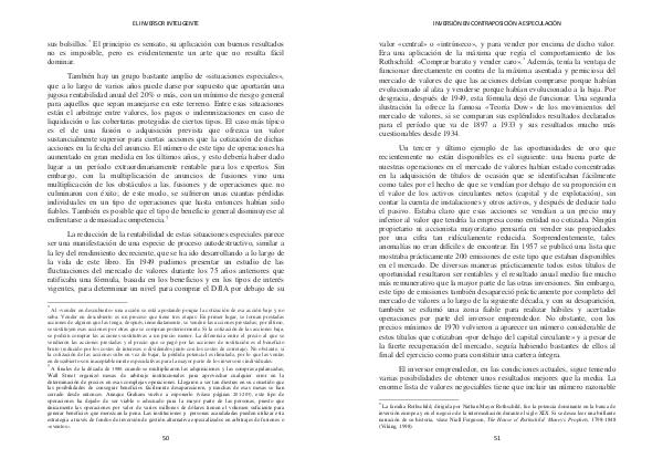 También hay un grupo bastante amplio de « situaciones especiales », que a lo largo de varios años puede darse por supuesto que aportarán una jugosa rentabilidad anual del 20 % o más, con un mínimo de riesgo general para aquellos que sepan manejarse en este terreno. Entre esas situaciones están el arbitraje entre valores, los pagos o indemnizaciones en caso de liquidación o las coberturas protegidas de ciertos tipos. El caso más típico es el de una fusión o adquisición prevista que ofrezca un valor sustancialmente superior para ciertas acciones que la cotización de dichas acciones en la fecha del anuncio. El número de este tipo de operaciones ha aumentado en gran medida en los últimos años, y esto debería haber dado lugar a un período extraordinariamente rentable para los expertos. Sin embargo, con la multiplicación de anuncios de fusiones vino una multiplicación de los obstáculos a las. fusiones y de operaciones que. no culminaron con éxito; de este modo, se sufrieron unas cuantas pérdidas individuales en un tipo de operaciones que hasta entonces habían sido fiables. También es posible que el tipo de beneficio general disminuyese al enfrentarse a demasiada competencia. †