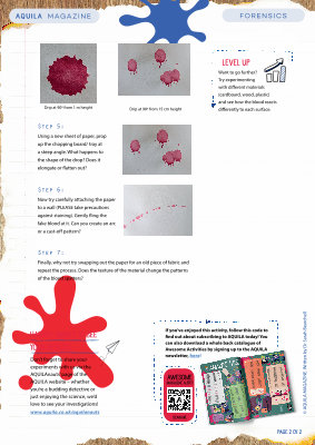 LEVEL UP Want to go further ? Try experimenting with different materials ( cardboard , wood , plastic ) and see how the blood reacts differently to each surface .