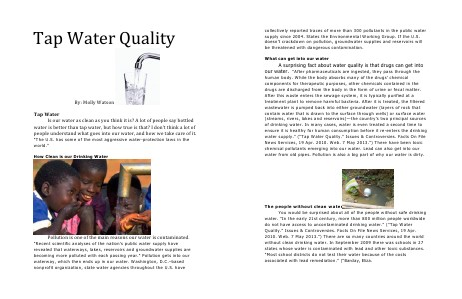 A surprising fact about water quality is that drugs can get into our water. " After pharmaceuticals are ingested, they pass through the human body. While the body absorbs many of the drugs ' chemical components for therapeutic purposes, other chemicals contained in the drugs are discharged from the body in the form of urine or fecal matter. After this waste enters the sewage system, it is typically purified at a treatment plant to remove harmful bacteria. After it is treated, the filtered wastewater is pumped back into either groundwater( layers of rock that contain water that is drawn to the surface through wells) or surface water( streams, rivers, lakes and reservoirs)— the country ' s two principal sources of drinking water. In many cases, water is even treated a second time to ensure it is healthy for human consumption before it re-enters the drinking water supply."(“ Tap Water Quality." Issues & Controversies. Facts On File News Services, 19 Apr. 2010. Web. 7 May 2013.”) There have been toxic chemical pollutants emerging into our water. Lead can also get into our water from old pipes. Pollution is also a big part of why our water is dirty.