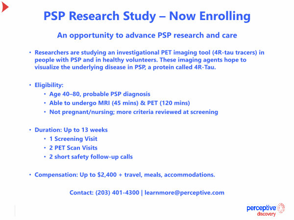• Researchers are studying an investigational PET imaging tool( 4R-tau tracers) in people with PSP and in healthy volunteers. These imaging agents hope to visualize the underlying disease in PSP, a protein called 4R-Tau.